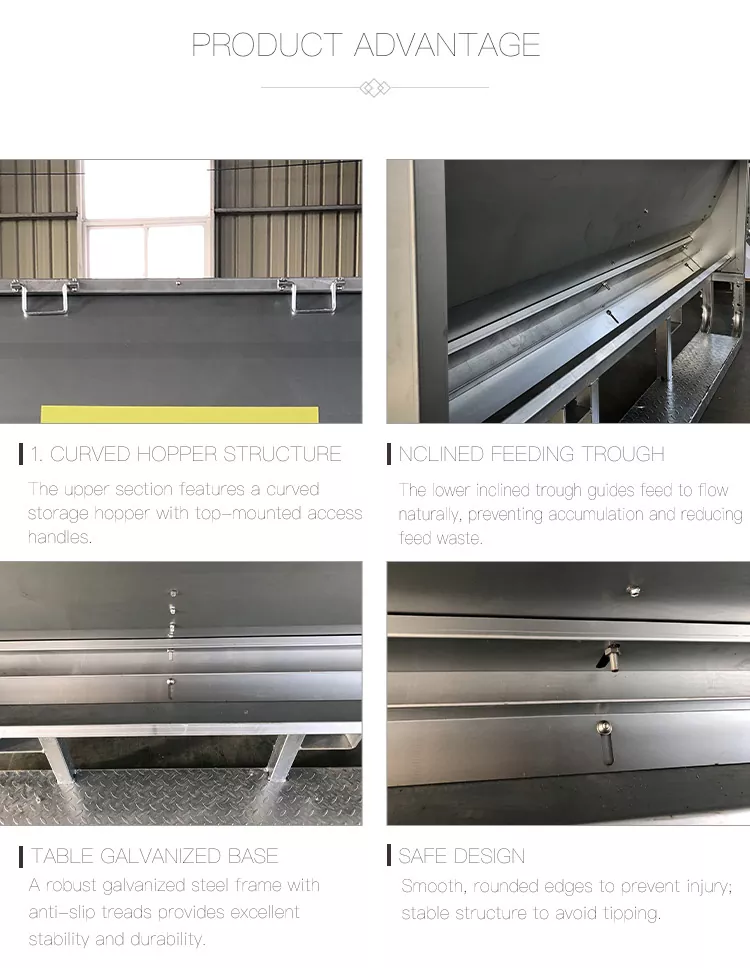 2. சாய்ந்த உணவுத் தொட்டி: கீழ் சாய்ந்த தொட்டி வழிகாட்டிகள் இயற்கையாகப் பாய்வதற்கு உணவளிக்கின்றன, திரட்சியைத் தடுக்கின்றன மற்றும் தீவனக் கழிவுகளைக் குறைக்கின்றன.